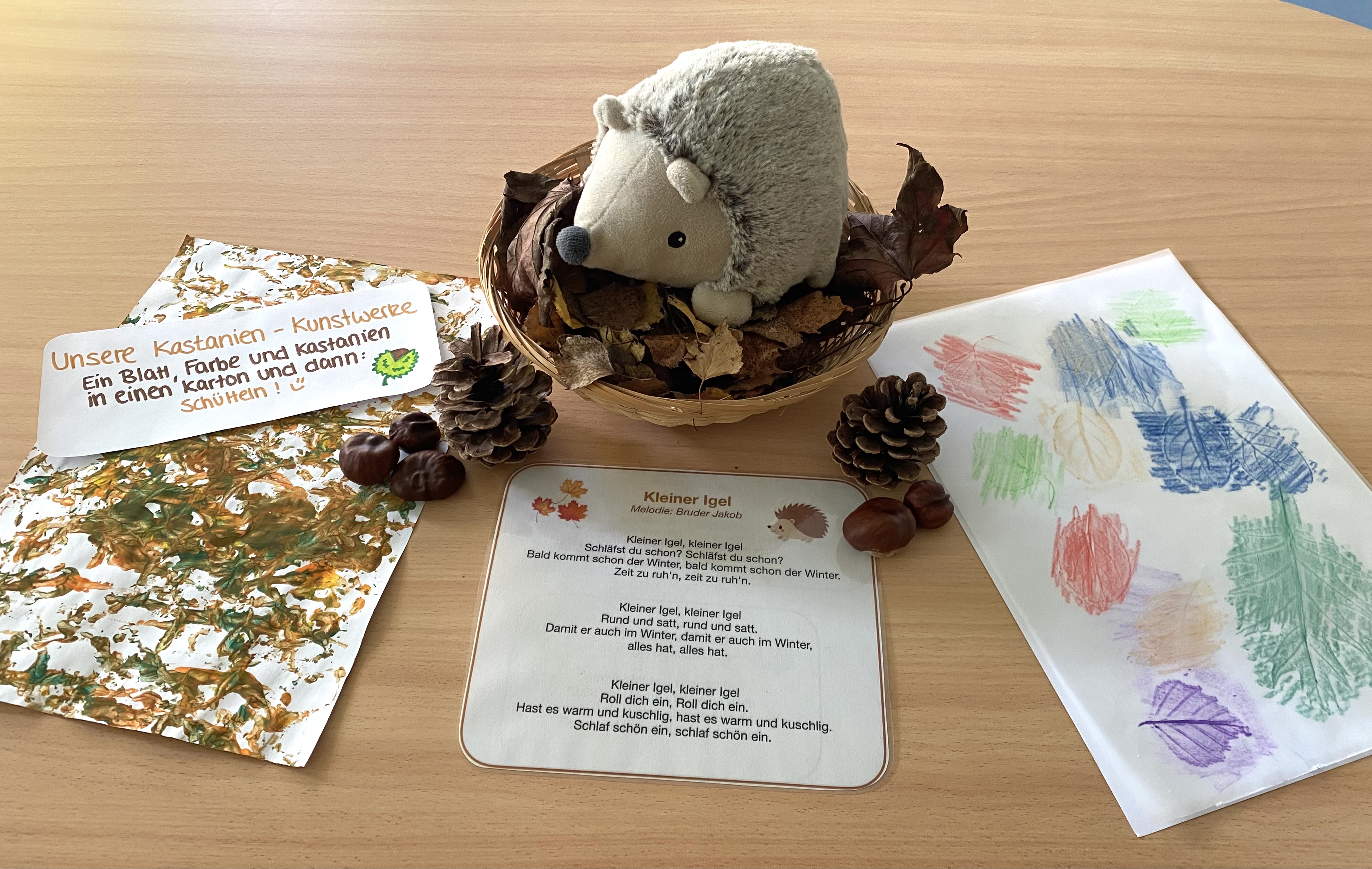 Mit viel Freude basteln und spielen wir mit Naturmaterialien wie Kastanien und Blättern. So erleben schon unsere Kleinsten, wie vielfältig die Natur ist und wie wir sie in unseren Alltag einbeziehen können.