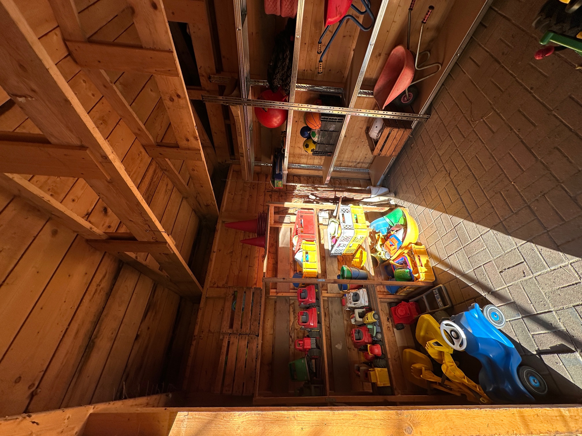 Zum einen wurde das Spielzeug Lager neu aufgesetzt! Neue Regale und Verstaumöglichkeiten ermöglichen uns nun einen schnellen und sicheren Zugriff auf alle Fahrzeuge, Bälle und Gartenspielgeräte. Zum anderen wurde ein Werkstattbereich für Holzarbeiten und Hausmeistertätigkeiten eingerichtet, ausgestattet mit stabilen Werkbänken, weiterem Stauraum und einer guten Beleuchtung.