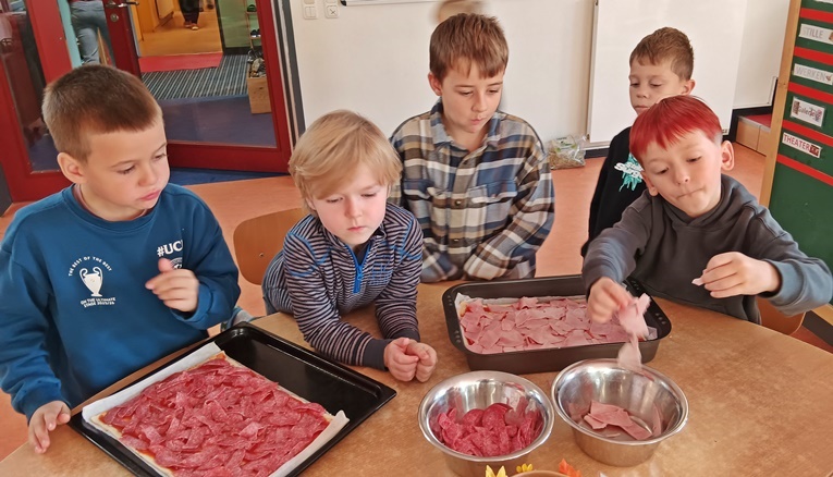 Neben viel Spiel und Spaß in den Horträumen gab es den traditionellen Kochtag. Per Abstimmung stand selbstgemachte Pizza auf dem Plan, die anschließend gemeinsam verputzt wurde.